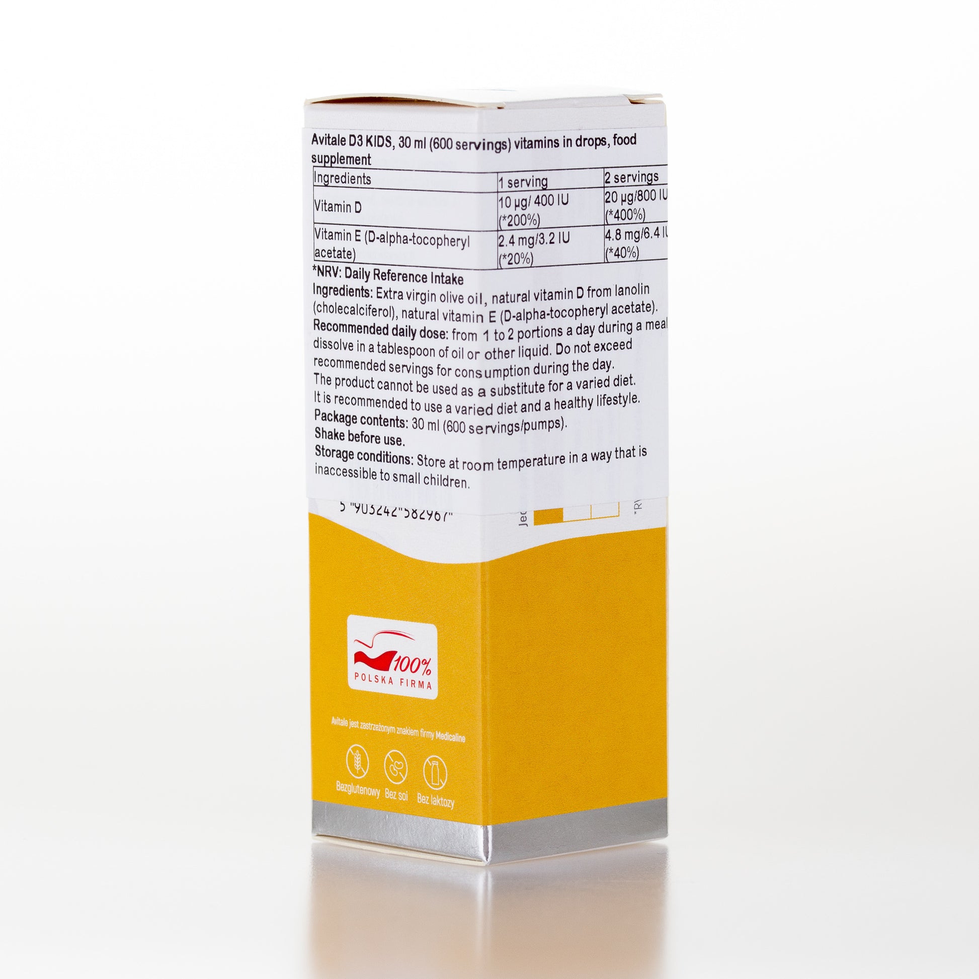 Avitale witamina D3 dla dzieci zawiera dawkę witaminy D dostosowaną do potrzeb dzieci w różnym wieku (400 IU w jednej kropli oraz 800 j.m. w dawce dziennej). Produkt zawiera witaminę D w postaci naturalnego cholekalcyferolu, pozyskiwanego z lanoliny. Witamina została rozpuszczona w oliwie z oliwek z pierwszego tłoczenia, dzięki czemu jest wysoce biodostępna.