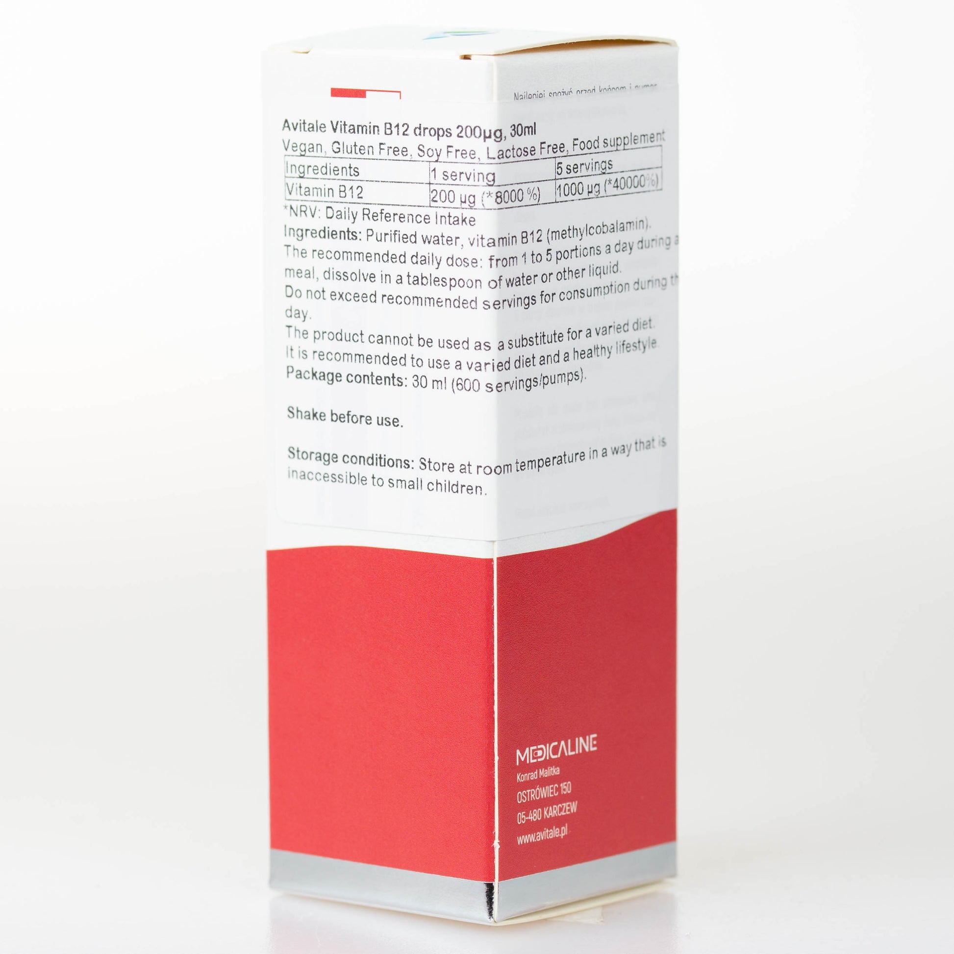 Składniki: Oczyszczona woda, witamina B12 (metylokobalamina).