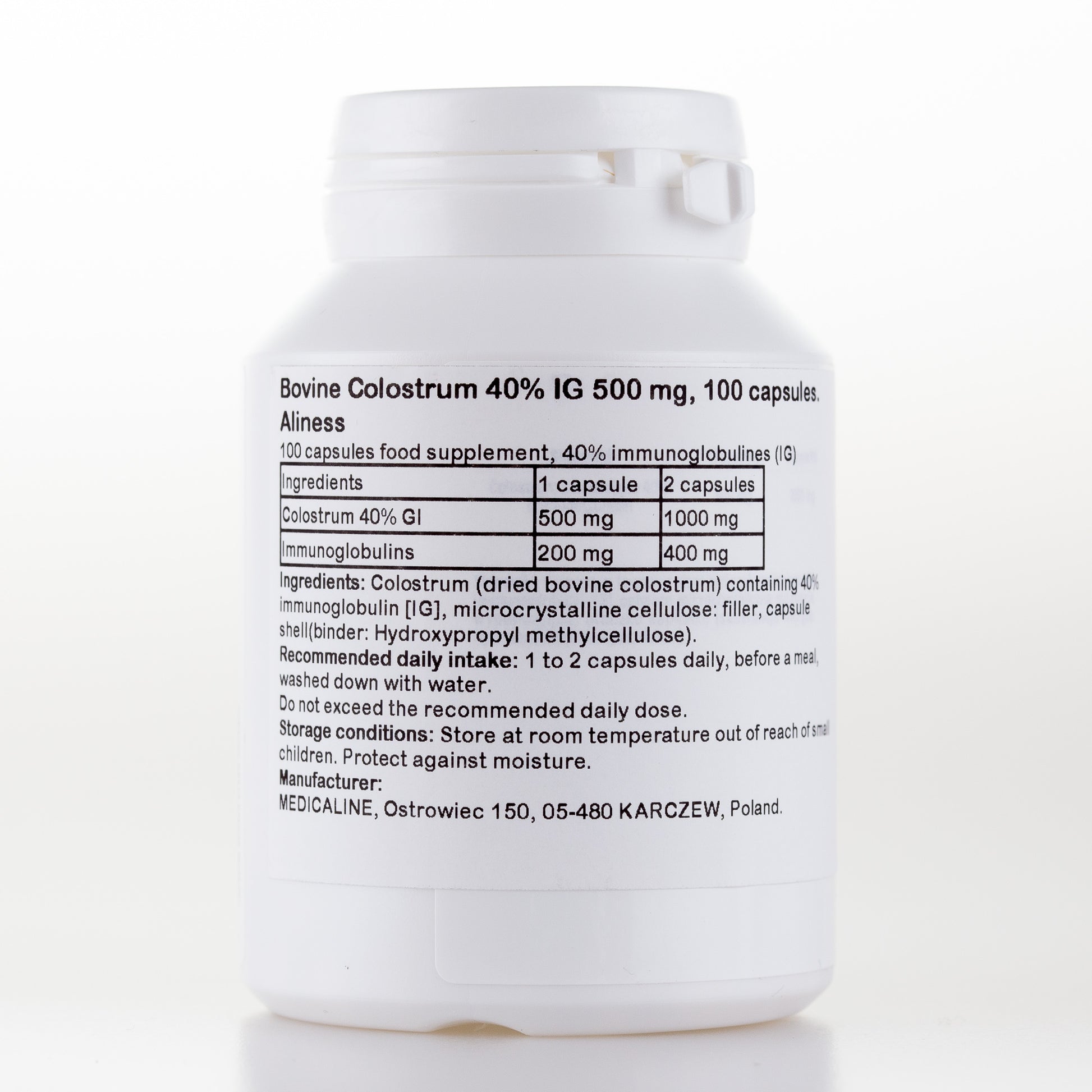 Składniki: Colostrum (suszona siara bydlęca) zawierająca 40% immunoglobuliny [IG], celuloza mikrokrystaliczna: wypełniacz, otoczka kapsułki: (spoiwo: hydroksypropylometyloceluloza).