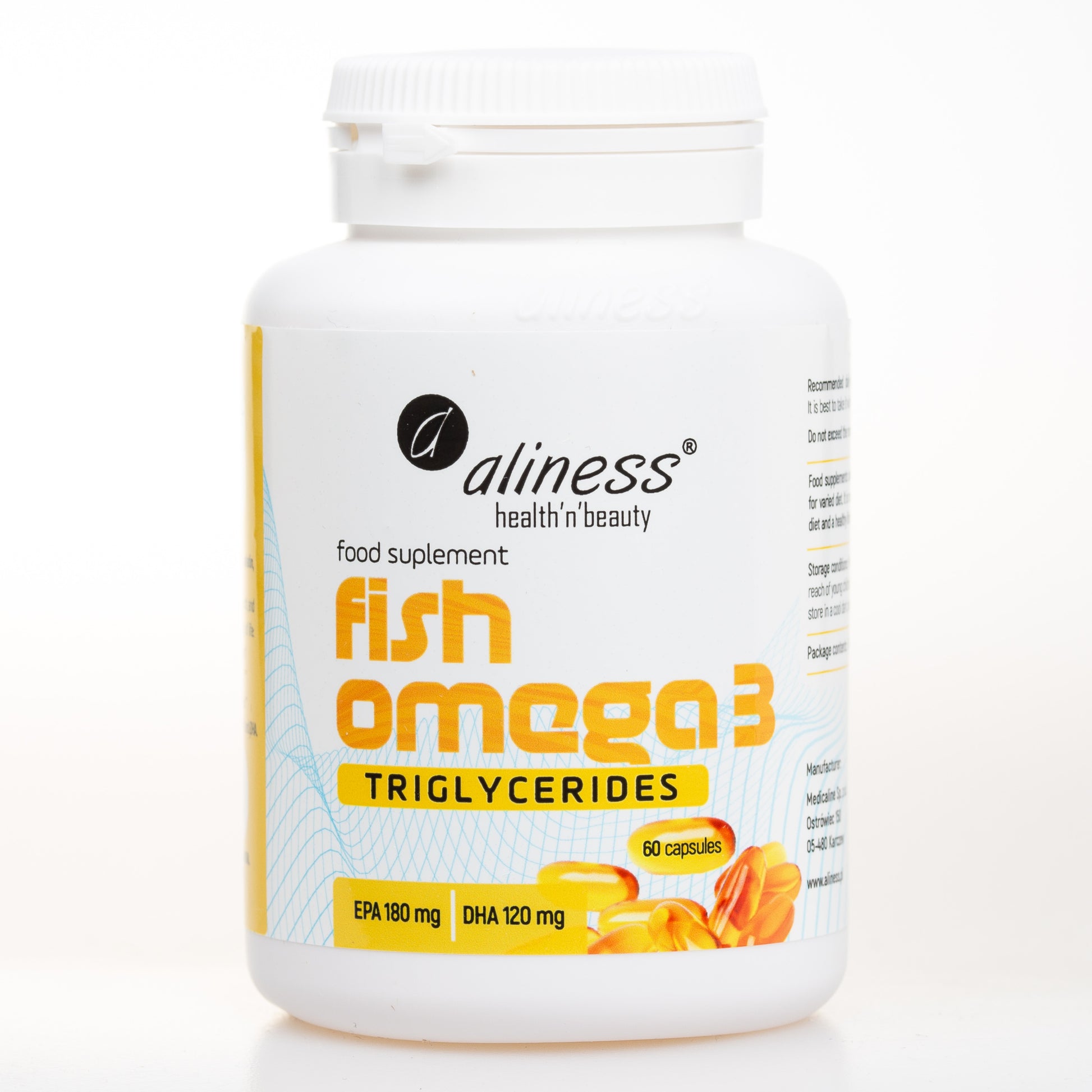 Aliness Fish Omega-3 Triglycerides is a source of omega-3 fatty acids, in an accessible soft gel form. The main ingredient is high-quality fish oil, which is characterized by a high concentration of omega-3 fatty acids.Omega-3: EPA (quash eicosapentaenoy) and DHA (quash docosahexaenoy) in the form of triglycerides.