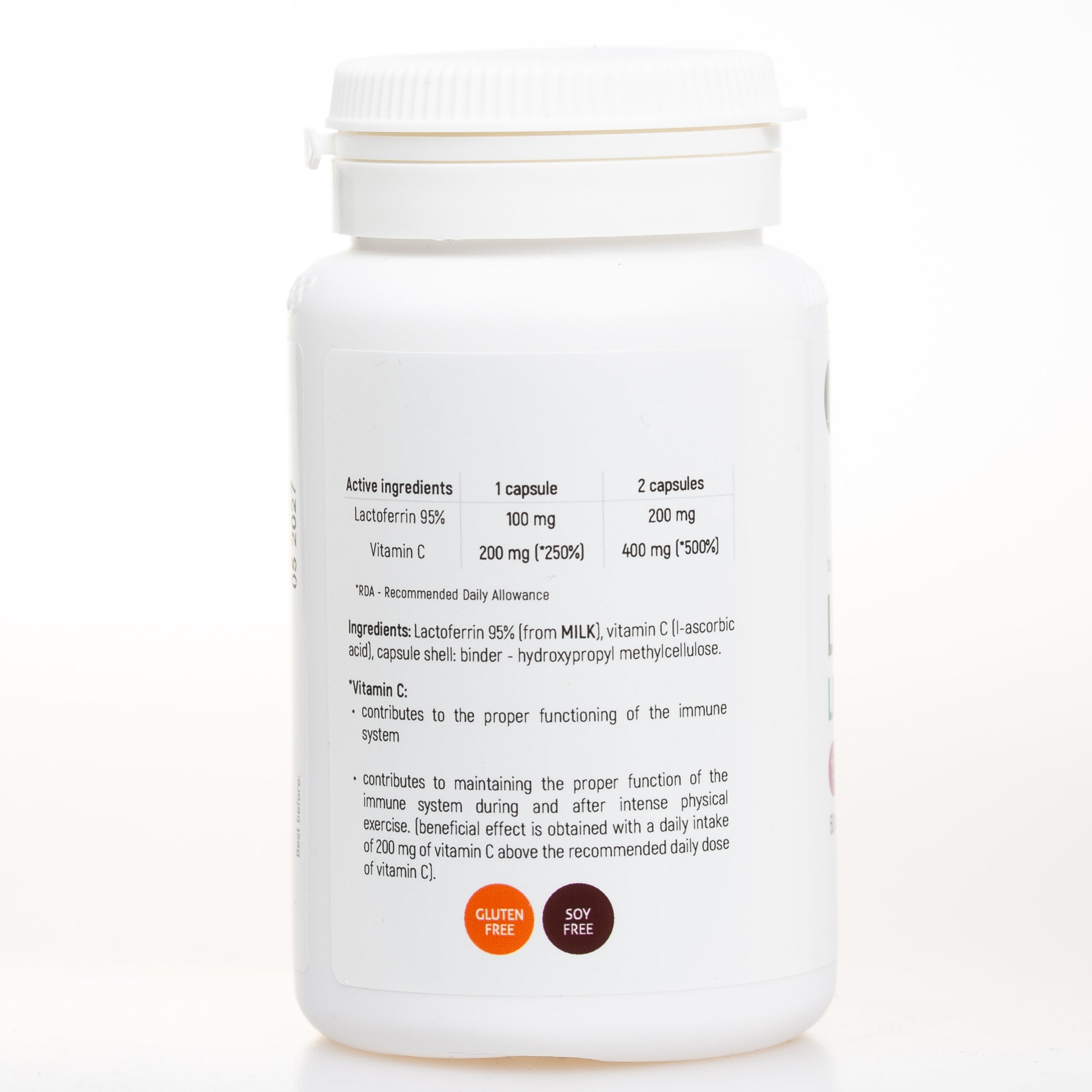 Składniki: Laktoferyna 90%, Witamina C (kwas L-askorbinowy), substancja wypełniająca: celuloza mikrokrystaliczna, otoczka kapsułki: (spoiwo: hydroksypropylometyloceluloza).