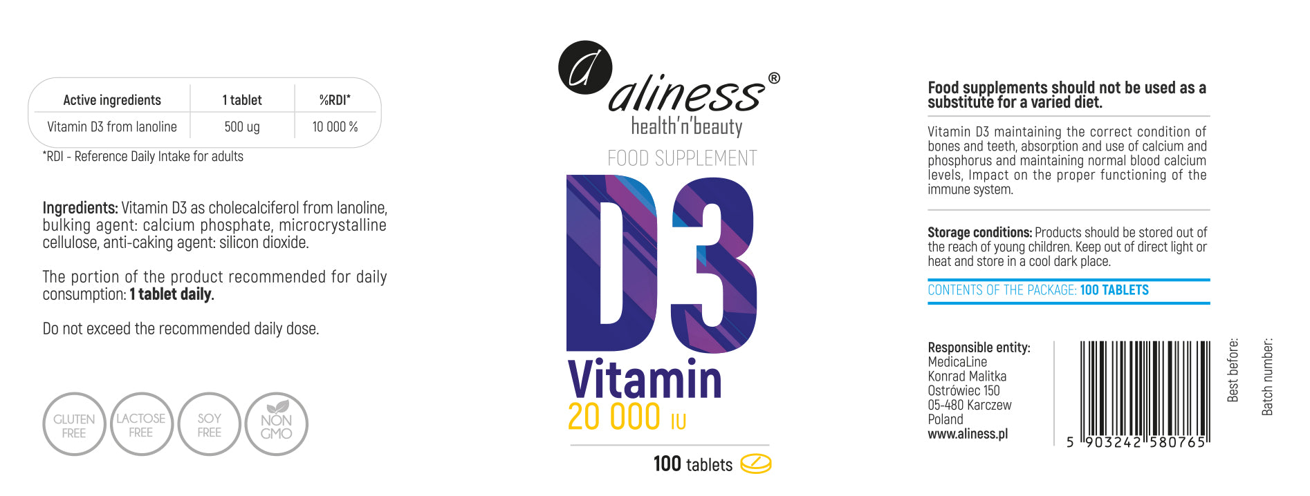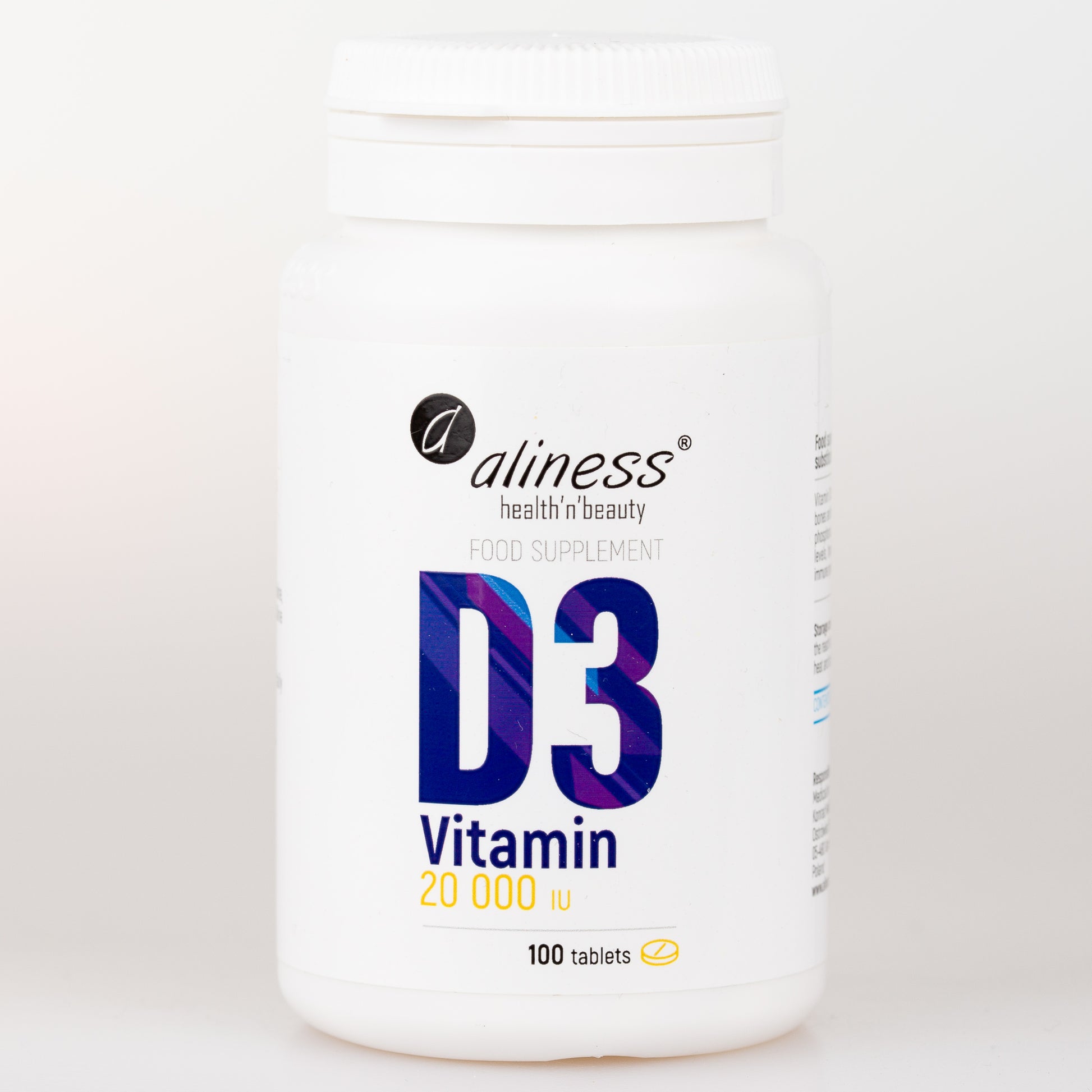 Aliness Witamina D3, 20000 IU, 100 tabletek, Maksymalna Dawka