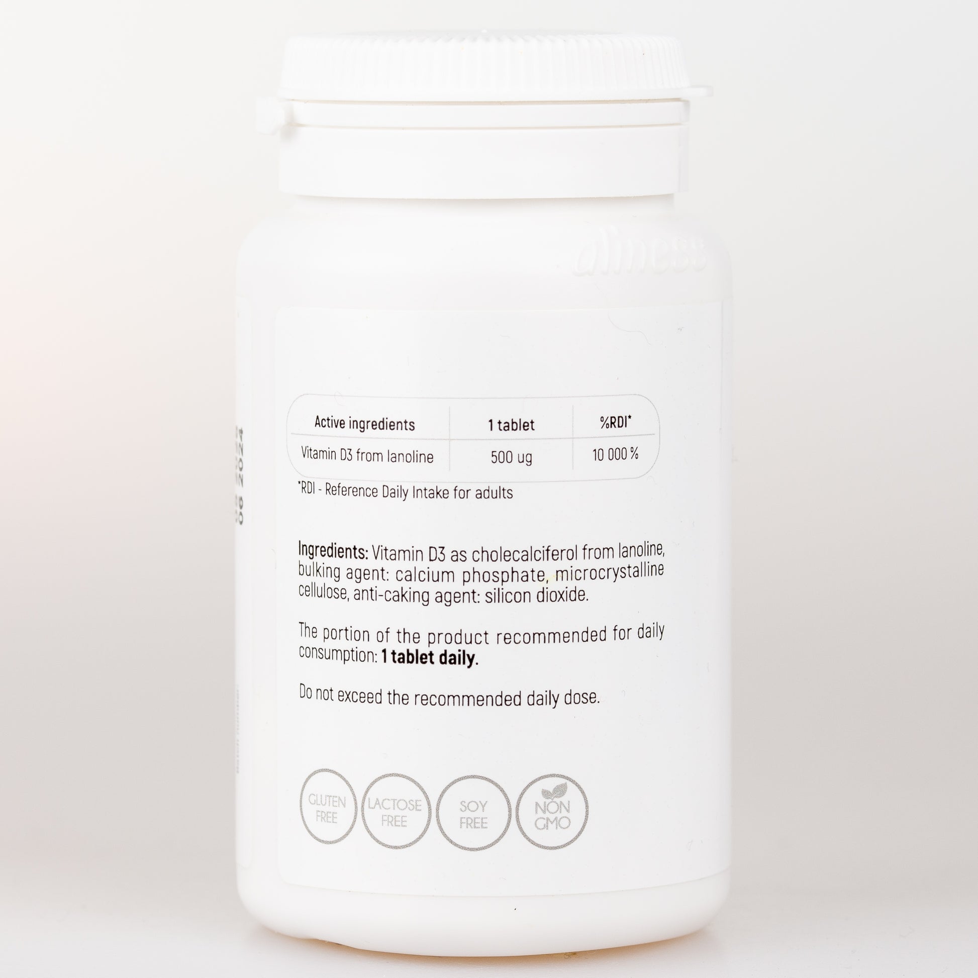 Składniki: Witamina D3 jako cholekalcyferol z lanoliny, substancja wypełniająca: fosforan wapnia, celuloza mikrokrystaliczna, substancja przeciwzbrylająca: dwutlenek krzemu.