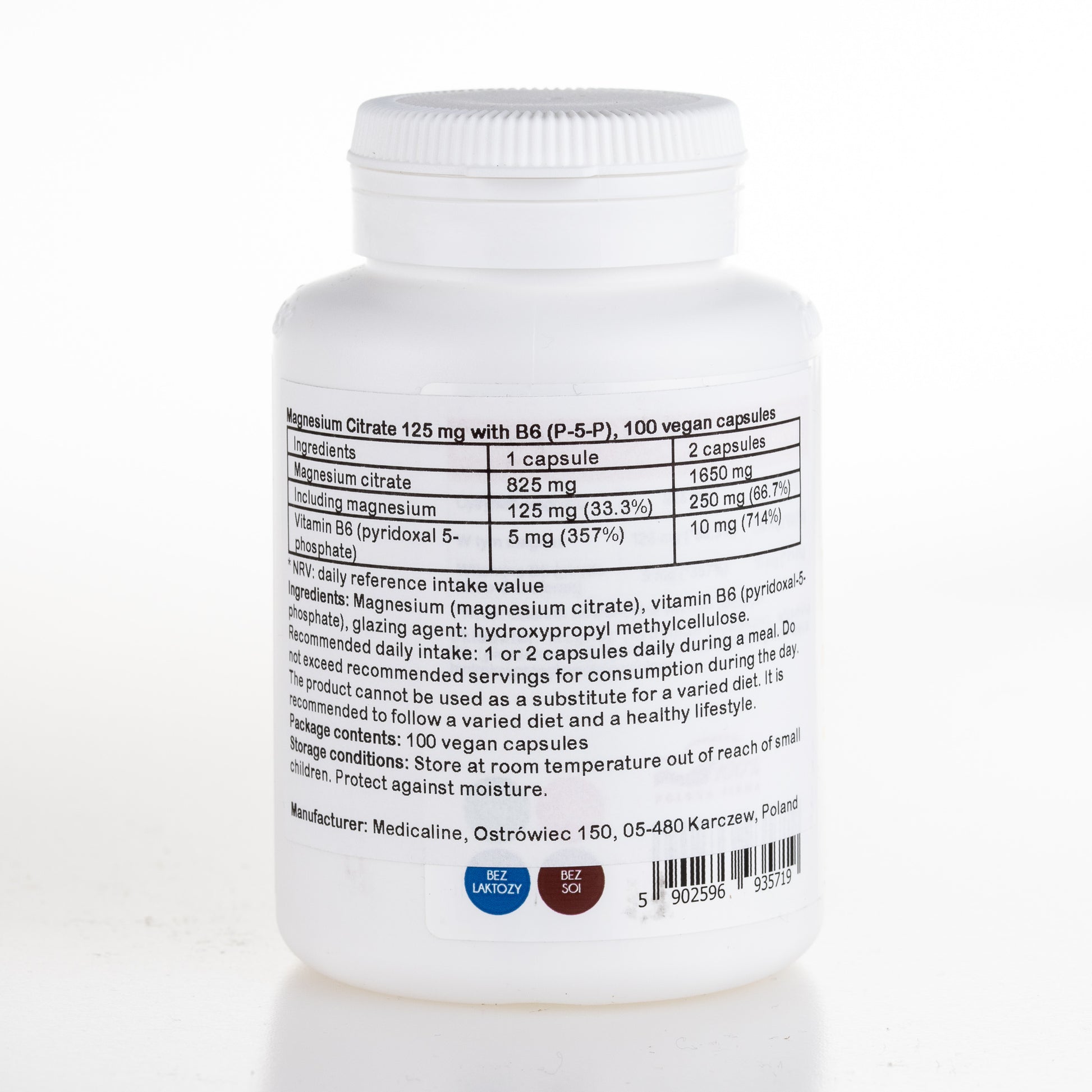 Magnesium Citrate 125mg with Vitamin B6 (P-5-P), 100 vegan capsules